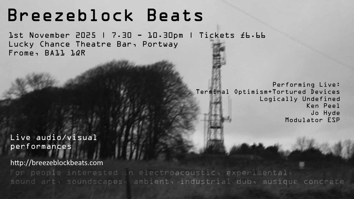 01/11/2025 | ![]() Lucky Chance Theatre Bar, Portway, Frome, BA11 1QR Performers: Terminal Optimism + Tortured Devices The Logically Undefined Ken Peel Jo Hyde Modulator ESP Live visuals by Patrick Dunn Tickets (ÂŁ6.66 incl Fees) here: https://buytickets.at/theluckychance/1883206 |